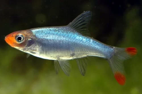 Очень маленькая рыбка, достигающая в длину не более 2,5 см., имеет изящное стройное тело. Самцы обладают ярко окрашенной головой и хвостом в оранжевый или красный цвета, тело молочно-синего оттенка. Самки в свою очередь однотонные, без ярких красок, цвет варьируется от серебристого до светло-оливкового, плавники прозрачные. Подобную окраску имеет Красноносая Тетра из Южной Америки, но это совершенно разные виды, развившиеся отдельно на разных континентах.