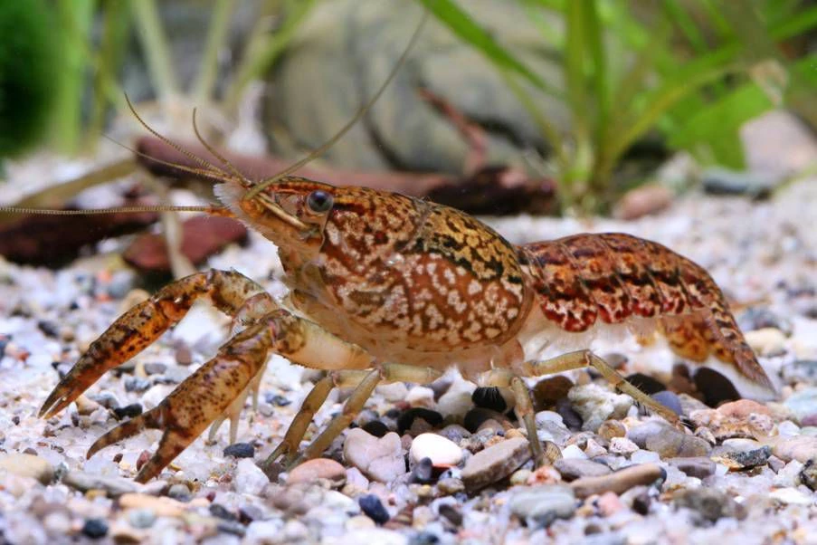Мраморный рак — декоративный пресноводный вид раков, отличительная черта которых — мраморный окрас и наличие только одного пола. Особенности: Размер: взрослые особи достигают 12–15 см, после чего продолжают медленно расти. Окрас: общий цвет варьируется от зеленоватого до чёрного и коричневого, а узор на теле создаёт впечатление мраморных разводов. У молодого рака окрас не ярко выраженный и почти прозрачный, но со временем рисунок становится всё более чёткий и контрастный. Форма: по форме идентичен обыкновенным ракам, отличается лишь размером. Содержание в аквариуме: Обязательное условие — наличие укрытия. Раки бодрствуют ночью, днём же большую часть времени проводят в тёмных укромных местах. Размер аквариума не играет особой роли, но лучше исходить из расчёта не менее 5 литров на особь. Стоит обеспечить ракам доступ к поверхности воды, поскольку у них есть потребность иногда дышать воздухом. Питание: мраморные раки едят практически любой тонущий корм, как сухой, так и живой. Кормить их рекомендуется на ночь, поскольку в это время их активность выше.