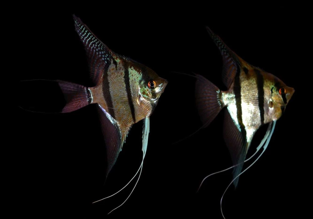 Скалярии, живущие свободно, одеты в мелкие серебристые чешуйки. По блестящему фону проведены темные поперечные полосы. Их цвет может быть разным: от болотного до почти черного. Контрастность, цветовая насыщенность полос зависит от настроения рыбы.
