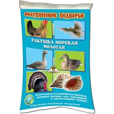 Ракушка морская–устраняет нарушения кальциевого обмена в организме птицы,предупреждает рахит,размягчение костей,истончение скорлупы и появление бесскорлуповых яиц. Способствует перетиранию корма в желудках птицы,обеспечивает очистку пищевода и выведение шлаков из организма птицы.