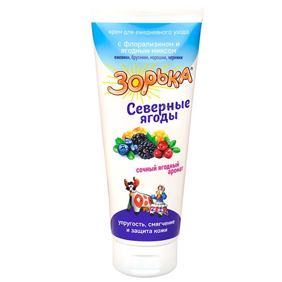 В состав крема «Зорька» Северные ягоды» с флорализином включен ягодный коктейль из ежевики, брусники, морошки и черники, способствующий повышению упругости и тонуса кожи.