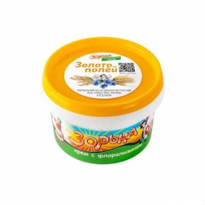 Крем для доения Зорька «Золото полей» с натуральными экстрактами овса, пшеницы, льна и хлопка, содержащий флорализин 10%, вазелин медицинский, консервант (сорбиновую кислоту) и эмульгатор (пентол, сорбитанолеат), представляет собой однородную массу от светло-желтого до желтого цвета с коричневым оттенком, со слабым специфическим запахом. Выпускается в полимерных банках по 200 г.