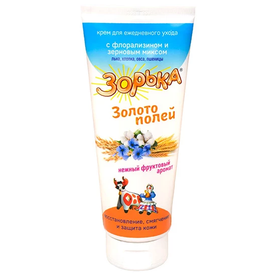 Крем для доения Зорька «Золото полей» с натуральными экстрактами овса, пшеницы, льна и хлопка, содержащий флорализин 10%, вазелин медицинский, консервант (сорбиновую кислоту) и эмульгатор (пентол, сорбитанолеат), представляет собой однородную массу от светло-желтого до желтого цвета с коричневым оттенком, со слабым специфическим запахом. Выпускается в полимерных банках по 200 г.
