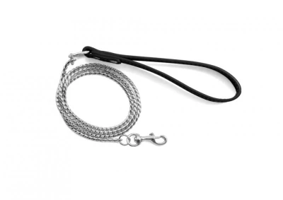 Звенья и кольца сварные, с качественным стойким хромированием, стальной карабин. Цепь имеет ровный строй, не перекручивается. Отлично подойдет для повседневного выгула, а также для дрессировки собаки. Кожаная ручка сделает использование максимально удобным для хозяина.