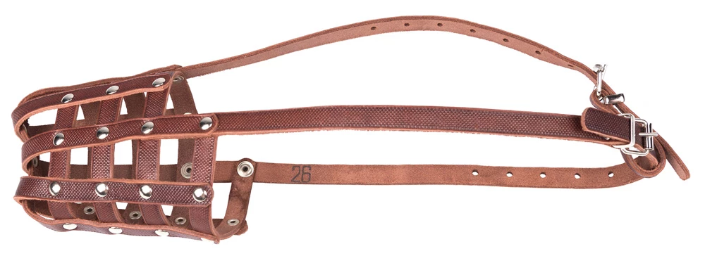 Универсальный кожаный намордник-корзинка с дополнительным налобным ремешком.