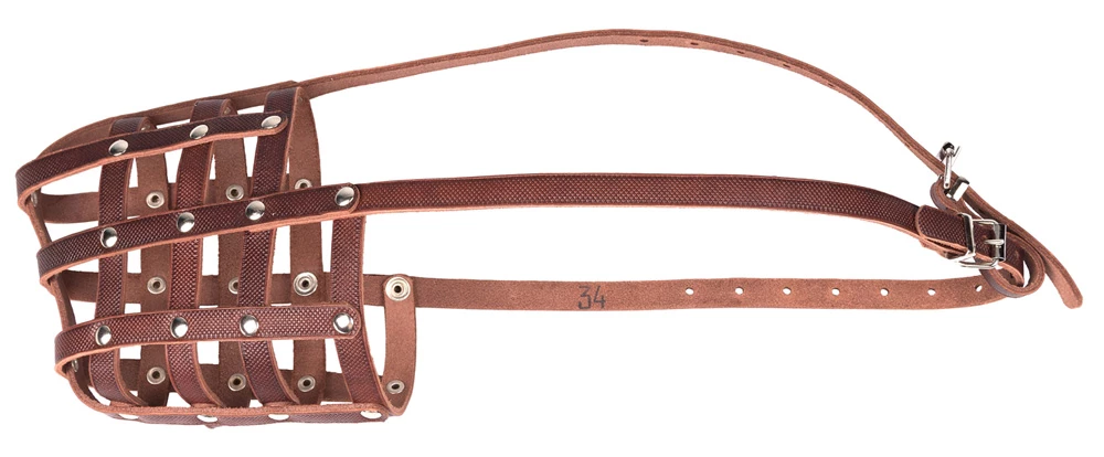 Универсальный кожаный намордник-корзинка с дополнительным налобным ремешком.