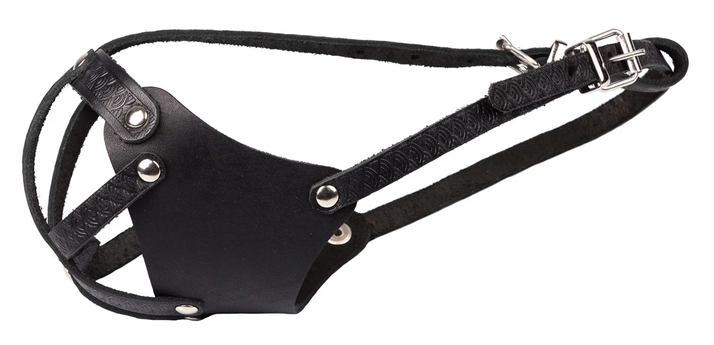 Эргономичный сплошной намордник из натуральной кожи, учитывающий породные особенности собак с укороченными челюстями. Оснащен дополнительным налобным ремешком.