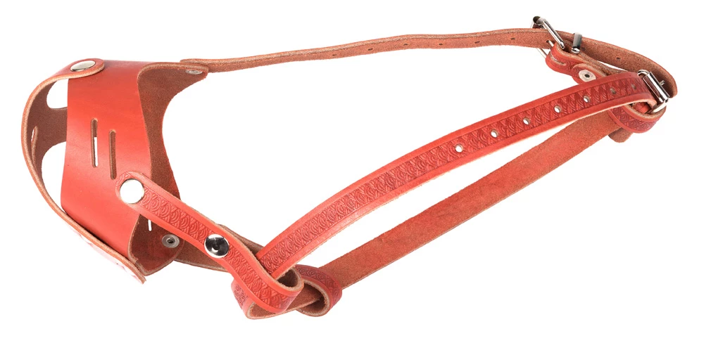 Эргономичный сплошной намордник из натуральной кожи, учитывающий породные особенности собак с укороченными челюстями. Оснащен дополнительным налобным ремешком.