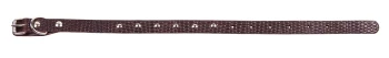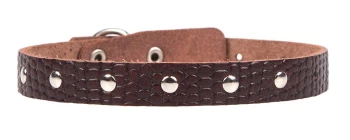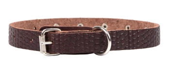 Ширина: 14 мм Обхват шеи: 24-34 см Однослойный ошейник из тисненой натуральной кожи, украшенный металлическими заклепками, не прошитый, полукольцо у пряжки. *Реальный цвет изделия может отличаться от цвета изделия на фото