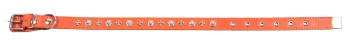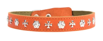 Двухслойный ошейник: верхний слой - натуральная кожа с металлическими украшениями, нижний - брезент. Прошит декоративной строчкой, снабжен металлическим наконечником, отверстия укреплены металлической блочкой, полукольцо у пряжки.