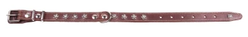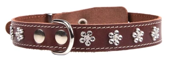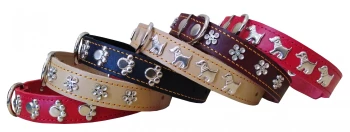 Однослойный ошейник из натуральной кожи с украшением "люкс" (возможные варианты - косточки, собачки, лапки, бантики, цветы), прошит декоративной строчкой, полукольцо посередине.