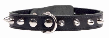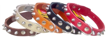 Ширина: 25 мм Обхват шеи: 42-53 см Двухслойный ошейник из натуральной кожи, украшенный шипами, проклеен, прошит декоративной строчкой, полукольцо посередине. *Реальный цвет изделия может отличаться от цвета изделия на фото