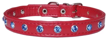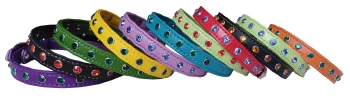 Ошейник из 4-х слоев мягкой искусственной кожи, проклеенный и прошитый декоративной строчкой, края в загибку. Украшен стразами. Полукольцо у пряжки. Цвета в ассортименте.