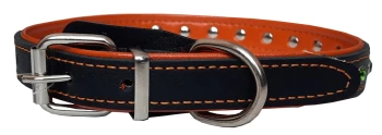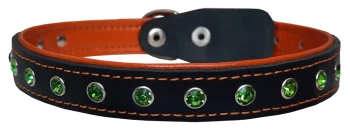 Ошейник из 3-х слоев кожи (верхний слой - натуральная кожа, низ - 2 слоя искусственной кожи), прошитый, края в загибку. Украшен стразами. Полукольцо у пряжки. Цвет верха - черный, коньяк, оранжевый, беж, красный.