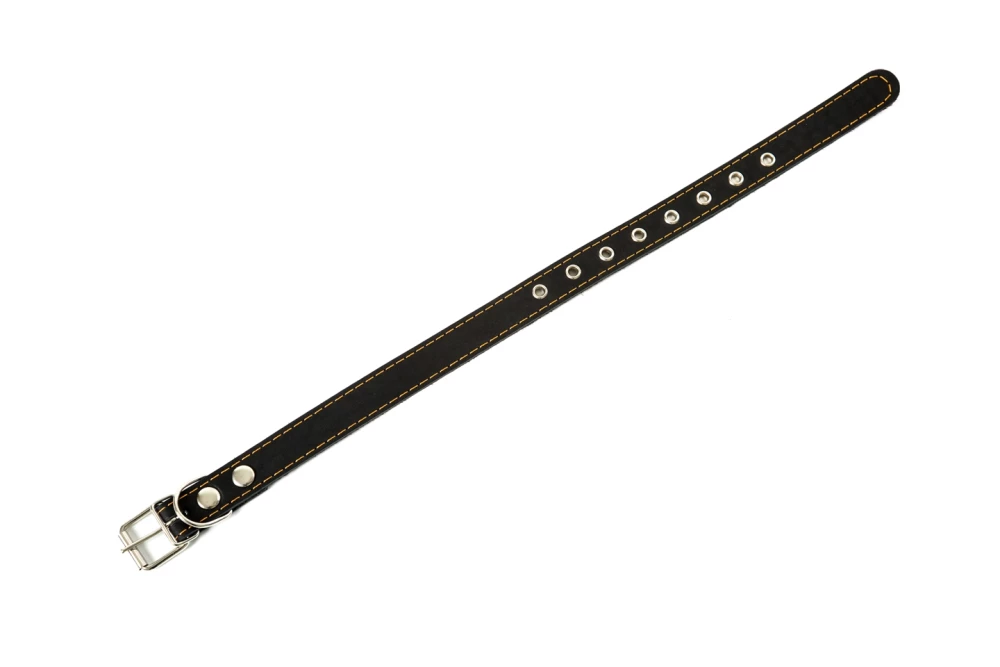 Ошейник сделан из двух слоев натуральной кожи хорошего качества. Для придания дополнительной прочности использована прошивка сверхпрочной нейлоновой нитью, устойчивой гниению. Фурнитура сварная, рассчитана на большие нагрузки и усилена дополнительными клёпками.
