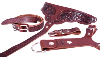 Шлейка для средних пород собак, из натуральной кожи, однослойная. Удобный нагрудный треугольник с изысканным тиснением. 4 регулировочных ремня для подгонки размера.