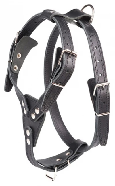 Шлейка из 2-х слоев натуральной кожи, прошитая. Нагрудный треугольник, 4 регулировочных ремня для подгонки размера.
