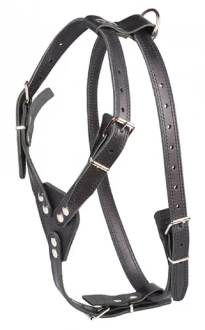 Шлейка из 2-х слоев натуральной кожи, прошитая. Нагрудный треугольник, 4 регулировочных ремня для подгонки размера.
