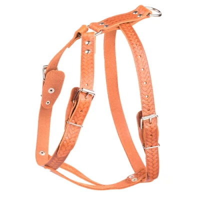 Эргономичная шлейка из натуральной кожи, учитывающая породные особенности собаки, однослойная, с тиснением, 3 регулировочных ремня для подгонки размера.