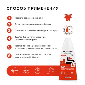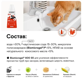 Средство для очищения труб и устранения засоров, которое не навредит трубам в доме и природе. Специально разработанное средство для очищения труб и сливов от шерсти домашних животных. Средство для труб удалит остатки волос, пищи и другие загрязнения в трубах и сливах. Средство для засоров подходит для любых типов труб, не разрушая их и не нарушая работу септиков. Благодаря формату густого геля средство экономично: лучше удерживается на поверхности, тем самым медленнее стекает по трубе, эффективнее уничтожая микробы и бактерии и тщательнее очищая внутреннюю поверхность трубы от самых стойких загрязнений. Средство без остатка уходит по стокам после смыва горячей водой. Рекомендуется использовать гель не только для устранения засоров, но и для профилактики раз в месяц. Перед применением обязательно встряхните, чтобы активировать формулу.