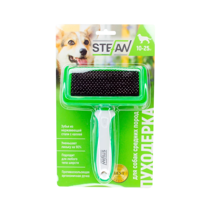 ПУХОДЕРКА с каплей STEFAN для ухода за шерстю домашних животных Особенности: Прочная пластиковая рабочая поверхность оснащена зубьями из высококачественной нержавеющей стали. Зубья проникают глубоко в шерсть и удаляют выпавшие волоски из подшерстка. Избавляет от перхоти и грязи, устраняет спутывания и колтуны, бережно вычесывает выпавшую шерсть. Зубья с каплями не царапают кожу Вашего питомца даже на чувствительных участках (внутренняя сторона лап, хвост, голова и другие). Возможно использование для сушки и укладки тонкой, шелковистой шерсти питомцев с чувствительной кожей. Обеспечивает легкий массажный эффект, улучшает кровообращение и делает шерсть Вашего питомца мягкой и блестящей. Делает процедуру вычесывания более комфортной для Вас и Вашего питомца. Противоскользящая ручка с эргономичным дизайном обеспечивает удобство во время процедуры вычесывания. Уход станет проще и эффективнее. Рекомендации по применению: 1. Пуходерка подходит для шерсти любой длины, а также жесткой или вьющейся шерсти. 2. Разделите шерсть на пряди и начинайте расчесывание с кончиков, постепенно продвигаясь к корням волос. 3. Движения должны быть легкие, поглаживающие, исключительно по направлению роста волос. 4. Очищайте и просушивайте инструмент после каждого использования. Внимание: 1. Хранить в недоступном для детей и животных месте. 2. Беречь от огня и раскаленных поверхностей. 3. Во избежание травмирования животного, использовать согласно рекомендациям.