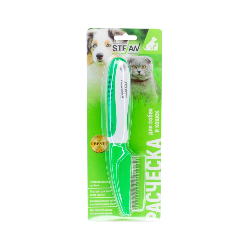 РАСЧЕСКА для собак и кошек STEFAN - 68 вращающихся зубьев из нержавеющей стали - разработана специально для эффективного ухода за шерстью домашних животных. Противоскользящая эргономичная ручка делает процедуру расчесывания простой и удобной. Особенность вращающихся зубьев в том, что они мягко захватывают подшерсток, обеспечивают плавный ход через спутанную шерсть, не цепляясь и не доставляя Вашему питомцу дискомфорт. Профессиональные закругленные концы зубьев исключат появление повреждений или царапин на коже Вашего питомца. Специальное отверстие в ручке расчески позволяет подвешивать ее для удобства хранения. Подходит для кошек, собак и других домашних животных. Рекомендации по применению: 1. Перед процедурой расчесывания проверьте кожу Вашего питомца на наличие ран, синяков и других повреждений, которые могут быть скрыты под шерстью. При обнаружении каких-либо травм следует обратиться к ветеринару. 2. Делайте мягкие поглаживающие движения по направлению роста волос. Начинайте с головы и постепенно двигайтесь к хвосту питомца. Особое внимание уделите чувствительным местам на животе, лапах и хвосте. При обнаружении колтуна не прикладывайте большие усилия, чтобы сразу прочесать его. Избегайте повторяющихся сильных нажимов в одном и том же месте. Если Вы заметите покраснение или раздражение на коже питомца, процедуру следует прекратить. 3. Используйте расческу перед водными процедурами для удаления колтунов и спутываний. Если колтун слишком большой воспользуйтесь колтунорезом или обратитесь к профессиональному грумеру. 4. Очищайте и просушивайте инструмент после каждого использования. Внимание: 1. Хранить в недоступном для детей и животных месте. 2. Беречь от огня и раскаленных поверхностей. 3. Во избежание травмирования животного, использовать согласно рекомендациям.
