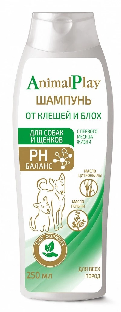 Шампунь от клещей и блох, для собак и щенков всех пород. Эфирные масла цитронеллы и полыни обладают особым природным составом, благодаря чему эффективно защищают от эктопаразитов, а также оказывают мощное укрепляющее, смягчающее и восстанавливающее действие на кожу и шерсть, обладают антибактериальным эффектом. Натуральная вспенивающая основа мягко очищает чувствительную кожу, не повреждая природный защитный слой. Мягкие моющие компоненты шампуня глубоко очищают и дезодорируют шерсть, не нарушая природный защитный слой, что позволяет применять шампунь так часто, как это необходимо. Идеально сбалансированная pH формула. Не раздражает слизистую оболочку глаз. Не содержит красителей. Придает шерсти свежий аромат.