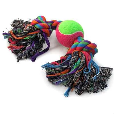 Веревка цветная с двумя узлами, весит и мяча 250-260г. Собаки обожают играть с веревочными игрушками, так как их можно грызть, трепать и носить в зубах. Такие игрушки отлично массируют десны и очищают зубной налет во время игры. Веревки сплетены из нетей натурального хлопка, поэтому безопасны для здоровья Вашего питомца. Цвета в ассортименте.