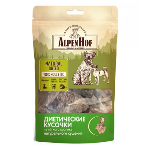 AlpenHof Диетические кусочки из легкого кролика натурального сушения — это идеальное угощение, перед которым не сможет устоять ни один питомец. Лакомство для собак из легкого кролика содержит легкоусвояемые белки и жиры – отличные источники энергии для питомца. Лакомство является гипоаллергенным и подходит для щенков с 2-х месячного возраста.