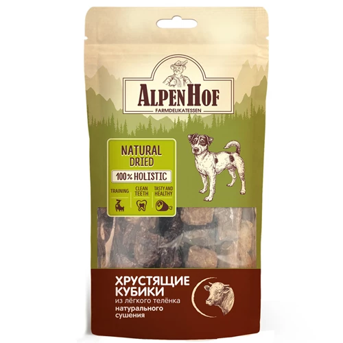 AlpenHof Хрустящие кубики из легкого теленка натурального сушения — это идеальное угощение, перед которым не сможет устоять ни один питомец. Лакомство для собак содержит много белка и практически не содержит жира. Лакомство из легкого теленка благоприятно влияет на состояние кожи и шерсти питомца, и на его иммунитет.