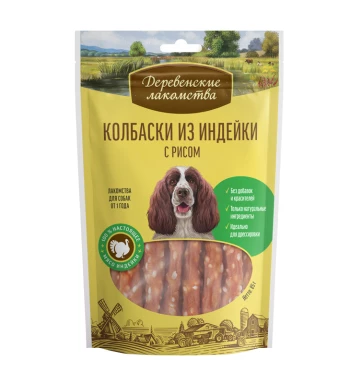 Нежнейшие колбаски из мяса индейки с добавлением риса станут отличной наградой собаке за хорошее поведение. Лакомство для взрослых собак средних и крупных пород.