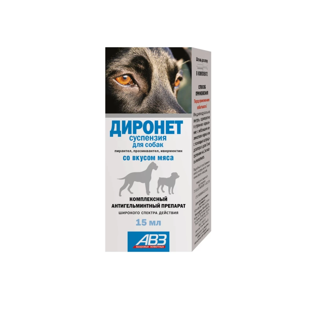 «Диронет» суспензия в 1 мл в качестве действующих веществ содержит: пирантела памоат – 15 мг, празиквантел – 5 мг и ивермектин – 0,006 мг и вспомогательные вещества. «Диронет» обладает широким спектром нематодоцидного и цестодоцидного действия, активен в отношении круглых и ленточных гельминтов, паразитирующих у собак и кошек, в т. ч. Toxocara canis, Т. cati, Toxascaris leonina, Uncinaria stenocephala, Ancylostoma caninum, Trichuris vulpis, Echinococcus granulosus, E. multilocularis, Diphyllobothrium latum, Dipylidium caninum, Multiceps multiceps, Taenia spp., а также личиночных фаз развития (микрофилярий) Dirofilaria immitis и Dirofilaria repens. Механизм действия ивермектина заключается в связывании с глутамат-зависимыми хлорными каналами, расположенными преимущественно в глотательных и соматических мышцах. В результате увеличивается проницаемость мембраны для ионов хлора, блокируется передача нервно-мышечного импульса, наступает паралич и гибель паразита. Механизм действия пирантела памоата заключается в блокировании нейромышечной передачи, нарушении проницаемости клеточных мембран и угнетении холинэстеразы, что также приводит к параличу и гибели паразита. Механизм действия празиквантела основан на нарушении у цестод транспорта глюкозы и микротубулярной функции, угнетении активности фумаратредуктазы и синтеза АТФ, повышении проницаемости клеточных мембран и нарушении мышечной иннервации.