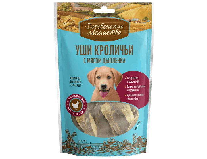 Комбинация хрустящих кроличьих ушек с нежным мясом цыплёнка создают уникальное лакомство, которое не только придётся по вкусу любой собаке, но и заставит её немного потрудиться. Лакомство для щенков.
