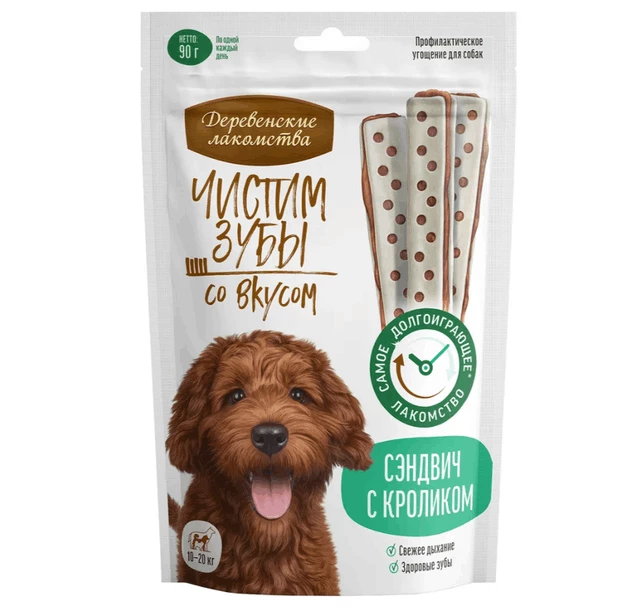 Супер-жевательное лакомство Сэндвич с кроликом эффективно удаляет зубной налёт, предотвращая образование зубного камня. Мясная начинка приготовлена из отборного филе кролика и не содержит искусственных консервантов и красителей. Теперь чистить зубы не только просто, но и вкусно!