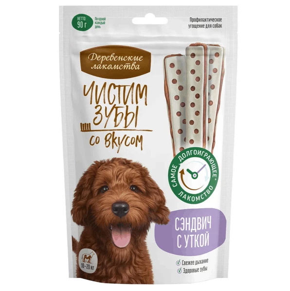 Супер-жевательное лакомство Сэндвич с уткой эффективно удаляет зубной налёт, предотвращая образование зубного камня. Мясная начинка приготовлена из отборного филе утки и не содержит искусственных консервантов и красителей. Теперь чистить зубы не только просто, но и вкусно!