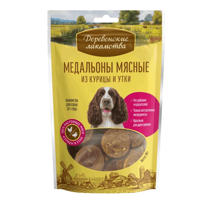 Медальоны из отборного мяса курицы и утки — полезное диетическое угощение для собак. Мягкая текстура и удобная форма лакомства — залог успеха тренировок или просто способ выразить свою любовь к питомцу.