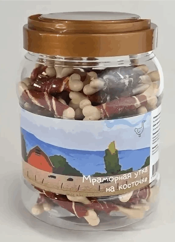 Состав: Утка 44%, куриный хрящ 3,5%, кальциевая косточка 45%, картофельный крахмал 5%, глицерин 1,75%, соль 0,25%, сорбат 0,5%.