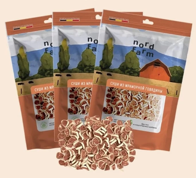 Суши из мраморной говядины - это замечательное лакомство для ваших питомцев. Изготовлены из натурального филе говядины и утки с аппетитной мраморной текстурой. Эти лакомства станут незаменимыми для дрессировки, обучения или просто для того, чтобы порадовать своего любимца.