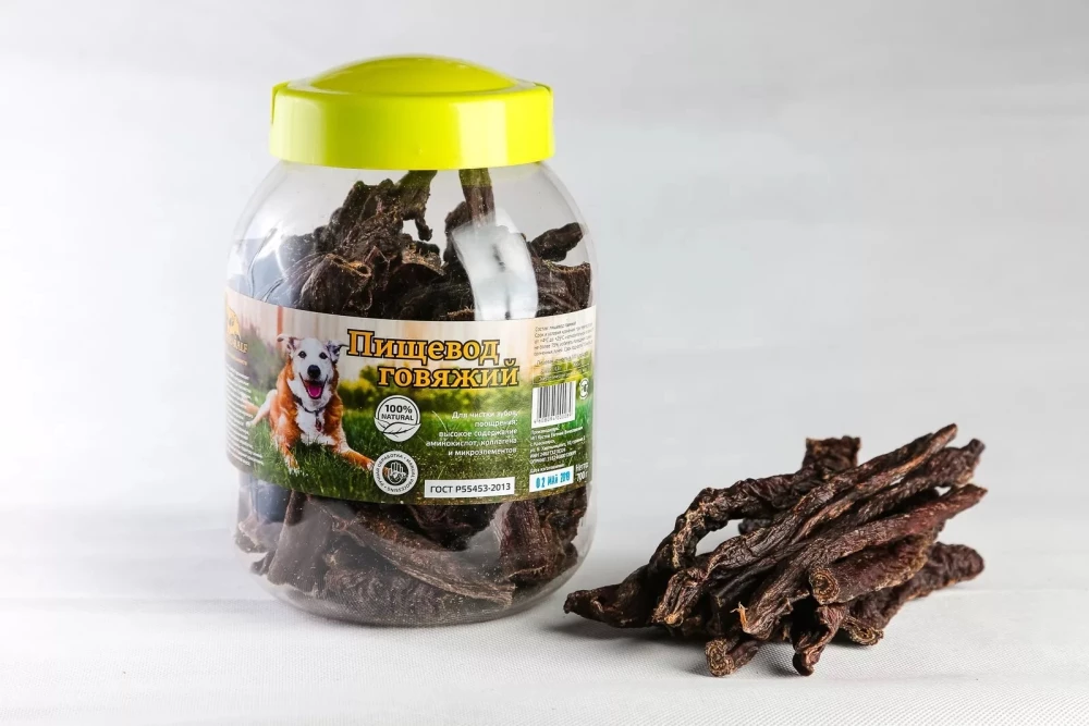 Пожалуй, ни один другой субпродукт для собак, не может похвастать таким высоким содержанием аминокислот, коллагена, микроэлементов. Мясо пищевода не похоже на обычное мускульное. Это трубка жвачного животного, через которую пища попадает в желудок, в высушенном виде представляет собой достаточно твердое лакомство, которое собаки обожают грызть часы напролет. Пищевод не вызывает аллергии и подходит всем собакам (можно угощать собак аллергиков), как любимая и иногда единственная радость.
