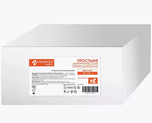 Neoterica Vetpro простыня хирургическая операционная, стерильная, одноразовая, 45х60 см. Neoterica Vetpro простыня хирургическая операционная, стерильная, одноразовая, 45х60 см Простыни хирургические стерильные одноразовые Neoterica Vetpro предназначены для формирования области операционного поля. 2 функциональных слоя: нетканый материал впитывает органические жидкости (кровь, лимфу) ; полиэтилен исключает промокание. Индикатор стерильности подтверждает безопасность каждой простыни. Цельное полотно позволяет максимально точно вырезать необходимое отверстие для проведения операции Размер простыни, см - 45х60