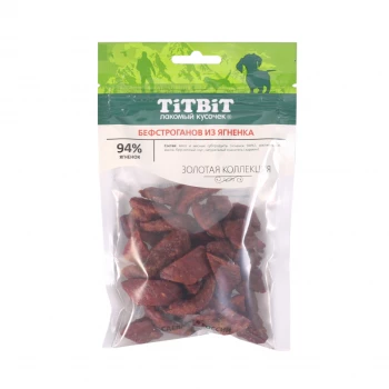 Золотая коллекция – это линейка лучших лакомств TITBIT, разработанных при участии владельцев домашних животных и их питомцев.¶Бефстроганов из ягненка - это мясной деликатес, который, благодаря высокому содержанию мяса (94 %) и бережной технологии приготовления, имеет привлекательный внешний вид, невероятный вкус и нежную текстуру.¶Ягненок, входящий в основу лакомства, является диетическим источником высококачественного животного белка, витаминов и минералов. Ни один гурман не сможет устоять перед таким деликатесом.