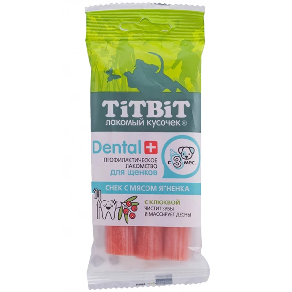 Профилактическое лакомство Dental+ Снек с мясом ягненка для щенков средних пород содержит ягодный сбор из клюквы, брусники, малины, которые обладают антиоксидантным и антибактериальным эффектом. Ежедневное употребление этого лакомства способствует чистке зубов, заживлению и регенерации тканей полости рта, мягкому массажу десен и формированию правильного прикуса у щенка. рис, мясо и мясные субпродукты (в том числе мясо ягненка), белок растительный, масла и животные жиры, лецитин, минеральные вещества, экстракт коры дуба, дрожжевой экстракт, натуральный ароматизатор, натуральный краситель. белки 8 г, жиры 2 г, зола 2,5 г, клетчатка 2,5 г, влага 20 г. Энергетическая ценность в 100 г: 310 ккал. Вяленые колбаски, печенье с телятиной, тарталетки с яблоком и манго – эти и многие другие лакомства для собак, кошек, а также домашних грызунов выпускает российская компания Альпинтекс под маркой TiTBiT. Почти 20 лет товары Тит Бит радуют питомцев и их хозяев не только в России, но и в других странах. Большой ассортимент товаров (более 500 наименований) позволяет подобрать оптимальный вариант лакомств и для миниатюрных собачек, и для гигантских собак, для кошек разных пород (благородных и не очень), для веселых птичек и серьезных грызунов. Кормовые добавки и лакомства для животных TiTBiT изготавливаются по особой технологии, без применения механической высокотемпературной обработки, благодаря чему сохраняется структура, естественный вкус и запах, а также питательные вещества и полезные микроэлементы натуральных продуктов
