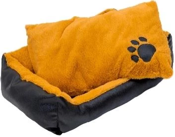 Уютный мягкий лежак прямоугольной формы с плотно набитыми синтепухом бортами и пухлой вынимающейся двухсторонней подушкой. Изготовлен из пушистого искусственного меха, скомбинированного с контрастной черной экокожей, из которой выполнены внешние стенки и аппликация в виде звериного следа. Изделие можно чистить, а в случае сильного загрязнения подвергать машинной стирке в деликатном режиме.