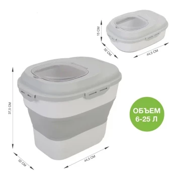 Складной контейнер для хранения способен вместить от 6 до 25 литров сухого корма. Контейнер обурудован крышкой с герметичной дверцей для обеспечения простоты доступа к содержимому. Хранение корма в закрытом контейнере сохранит его свежесть и сделает более комфортным его использование для Вас. Аксессуар изготовлен из высококачественного прочного пластика и прост в уходе.
