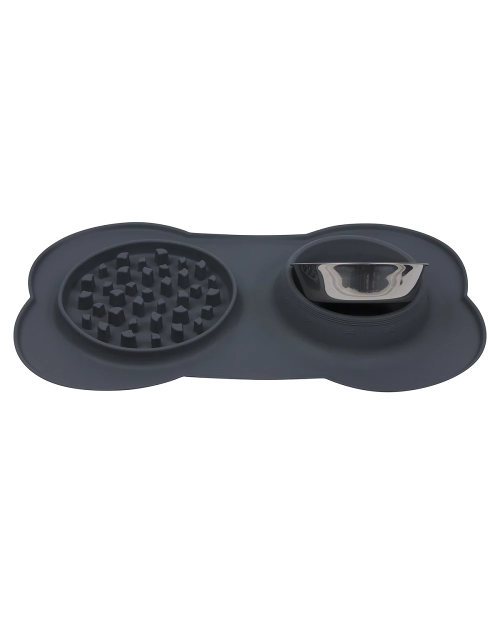 азмер: 590х345х55 Диаметр чаши: 175, глубина чаши 45, диаметр интерактивной зоны 230, глубина интер. зоны 22 Чашка, шт: х800мл Вес: 700 г Материал: Силикон пищевой, нержавеющая сталь Производство: Китай Силиконовая миска для кормления состоит из двух частей: миска из силикона для медленного поедания корма и стальная чаша объемом 800 мл, надежно закрепленная на силиконовой подставке. Полностью безвредные, нетоксичные изделия из пищевого силикона и нержавеющей стали не впитывают запахи и легко моются мыльным раствором. Подходят также для чистки в посудомоечной машине. Миска не займет много места, удачно впишется в Ваш интерьер и оставит чистым пол. Внимание! Чтобы избежать появления царапин и потери внешнего вида, аксессуар не рекомендуется мыть приспособлениями с абразивной поверхностью. Товар не подлежит обязательной сертификации.