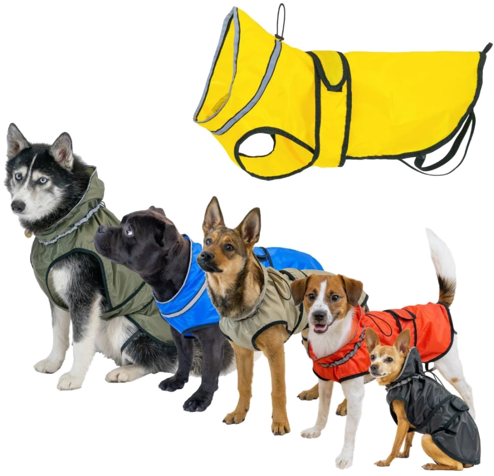 Дождевик для собак, лёгкий и практичный. Защищает от дождя, ветра и грязи. Имеет несколько видов регулировки: шнурок-резинку по воротнику, пояс на липучке, а так же фиксирующие резинки для задних лап, что позволяет максимально точно скорректировать данную модель под своего питомца. На воротнике расположена светоотражающая лента для лучшей видимости. Дождевик идёт в комплекте с мешочком для компактного хранения, благодаря чему он легко помещается в карман. Кроме того, мешочек имеет петлю на липучке, которую можно прикрепить к шлёвке брюк или поясу. Размер: обхват шеи 18-36см, обхват груди 26-36см, длина спины 25см.
