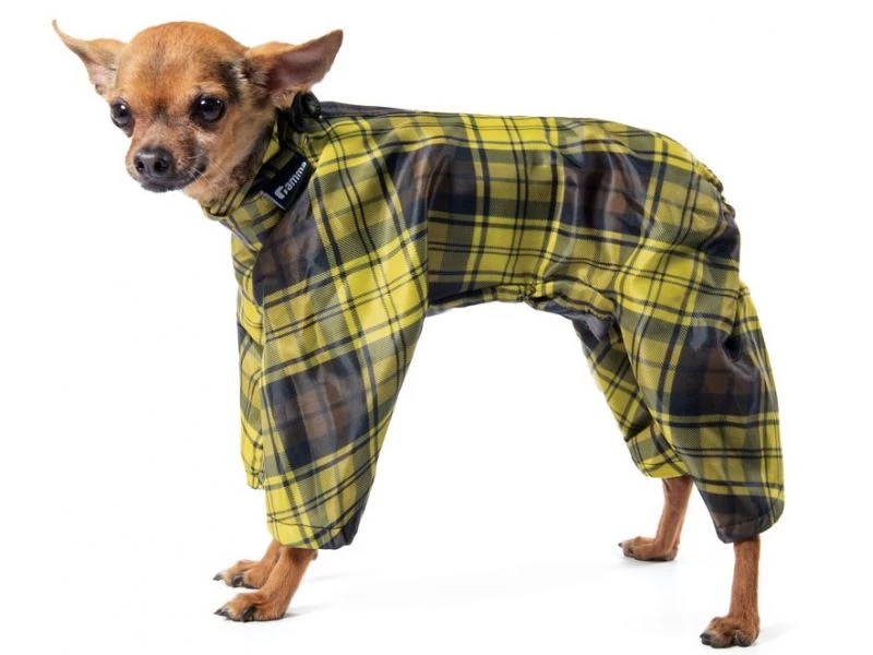 Комбинезон удобно садится по фигуре питомца и не стесняет его движений при прогулке. Изделие надежно фиксируется при помощи липучки на спине, ширина горловины регулируется при помощи завязки, а на штанинах предусмотрены удобные резинки, препятствующие попаданию грязи и влаги снизу.