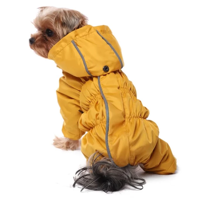 Комбинезон выполнен с учетом анатомических особенностей тела собаки, имеет специальные вставки из резинок, что позволяет изделию плотно сидеть на собаке, а также декорирован функциональным светоотражающим элементом.