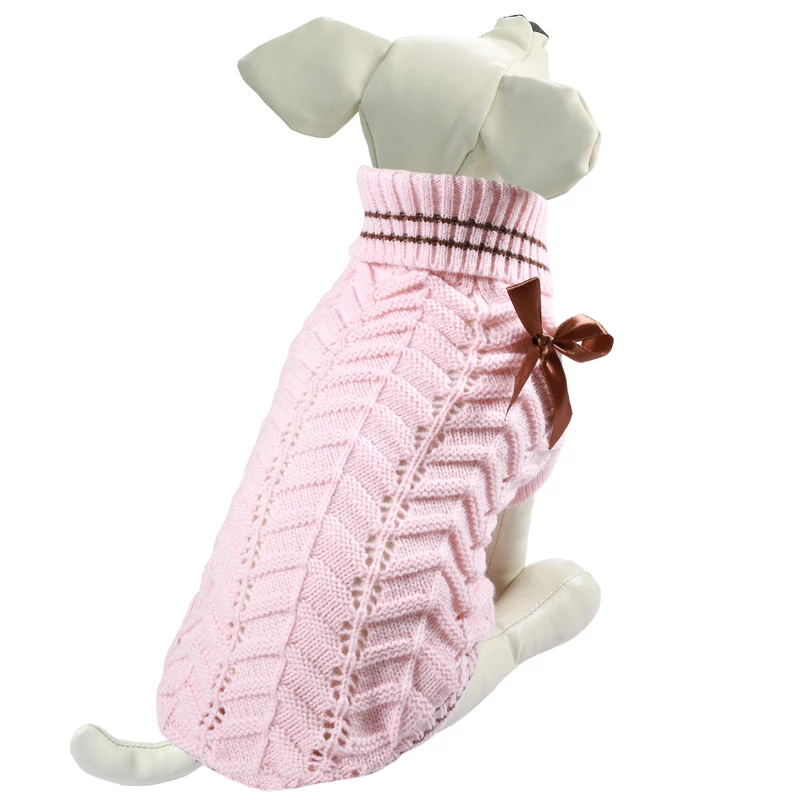 Свитер нежной расцветки и оригинальной вязки с украшением в виде банта - это удобный и функциональный аксессуар для собак, который просто незаменим в холодную погоду. Изделие защитит вашего питомца от ветра и согреет в непогоду, а универсальный фасон не будет стеснять движений питомца во время прогулки. Свитер прекрасно сидит на животном благодаря специальным лямочкам для задних лап, и манжетам для передних. Такой свитер со стильным дизайном станет украшением гардероба вашего питомца. Материал: акрил. Цвет: розовый. Размер: 30см (M).