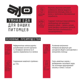 СУХОЙ ПОЛНОРАЦИОННЫЙ КОРМ С ГРЕЧКОЙ ДЛЯ ВЗРОСЛЫХ СОБАК КРУПНЫХ ПОРОД Вся продукция AJO® изготавливается на новейшем заводе, оснащенном сверхсовременным высокотехнологичным оборудованием, и соответствует мировым стандартам качества. Данная линейка представлена в самых оборачиваемых по весу упаковках.